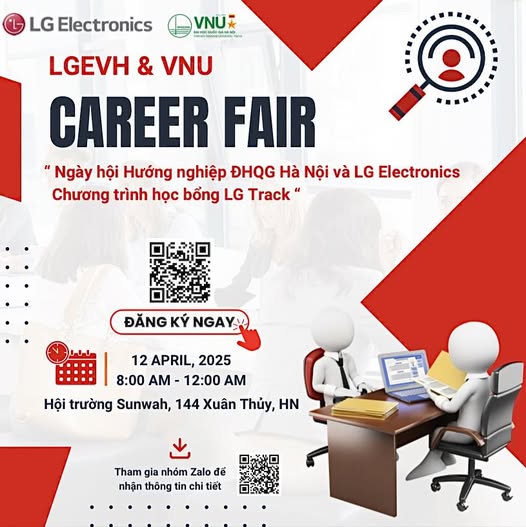 Nhằm tạo điều kiện cho sinh viên có cơ hội được tiếp cận các học bổng giá trị và tiếp xúc, trao đổi trực tiếp với doanh nghiệp về định hướng phát triển nghề nghiệp trong tương lai, nâng cao khả năng có việc làm sau tốt nghiệp; hỗ trợ các doanh nghiệp trong tuyển dụng (đối với sinh viên năm cuối), phối hợp với các đơn vị trong đào tạo, bồi dưỡng (đối với sinh viên đến năm thứ 3), ĐHQGHN tổ chức "Chương trình định hướng nghề nghiệp và kết nối việc làm giữa ĐHQGHN và Công ty LG Electronics Việt Nam (LGE)"